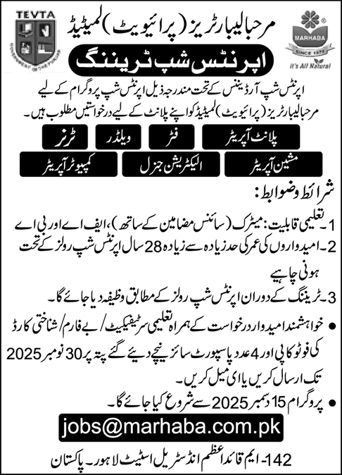 Marhaba Laboratories Pvt Ltd Lahore Apprenticeship Training 2025 November TEVTA Latest